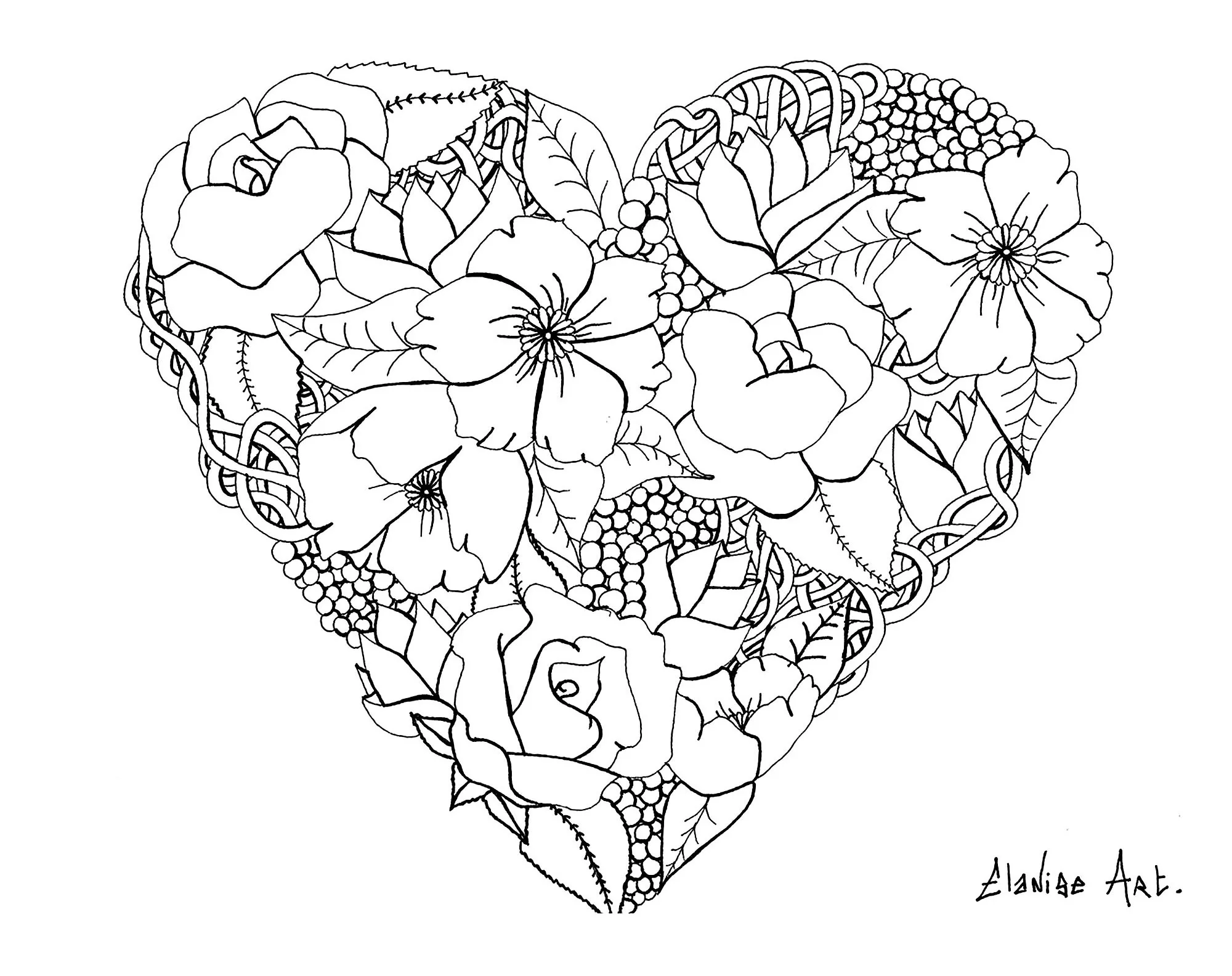 Bonito corazón florido, por Elanise. En realidad no es un mandala, sino una página para colorear con un corazón de flores realistas.